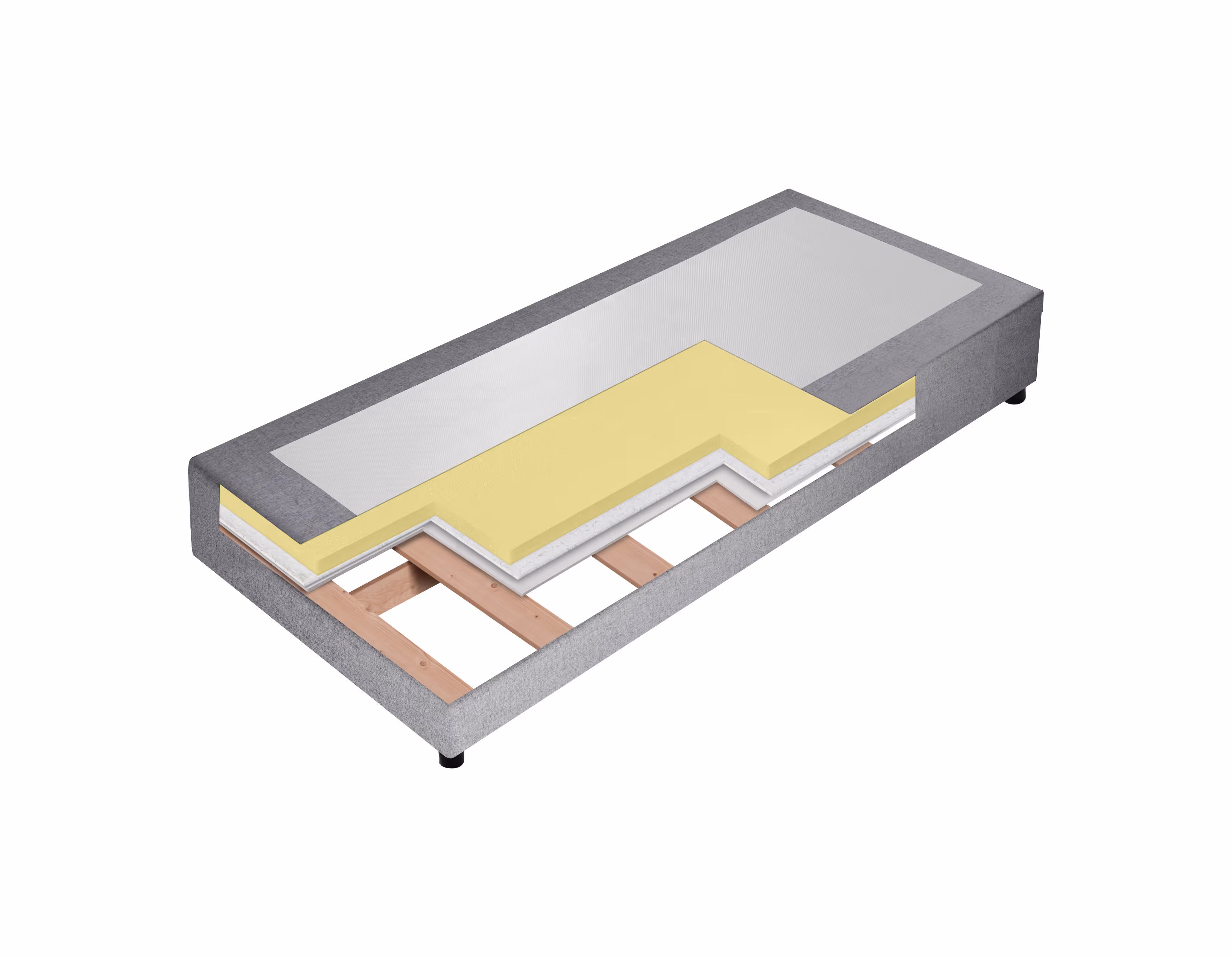 Gestoffeerd in diverse kleuren meubelstof en kunstleder. Voorzien van een spiegelstof met antislip om verschuiven van het matras te voorkomen