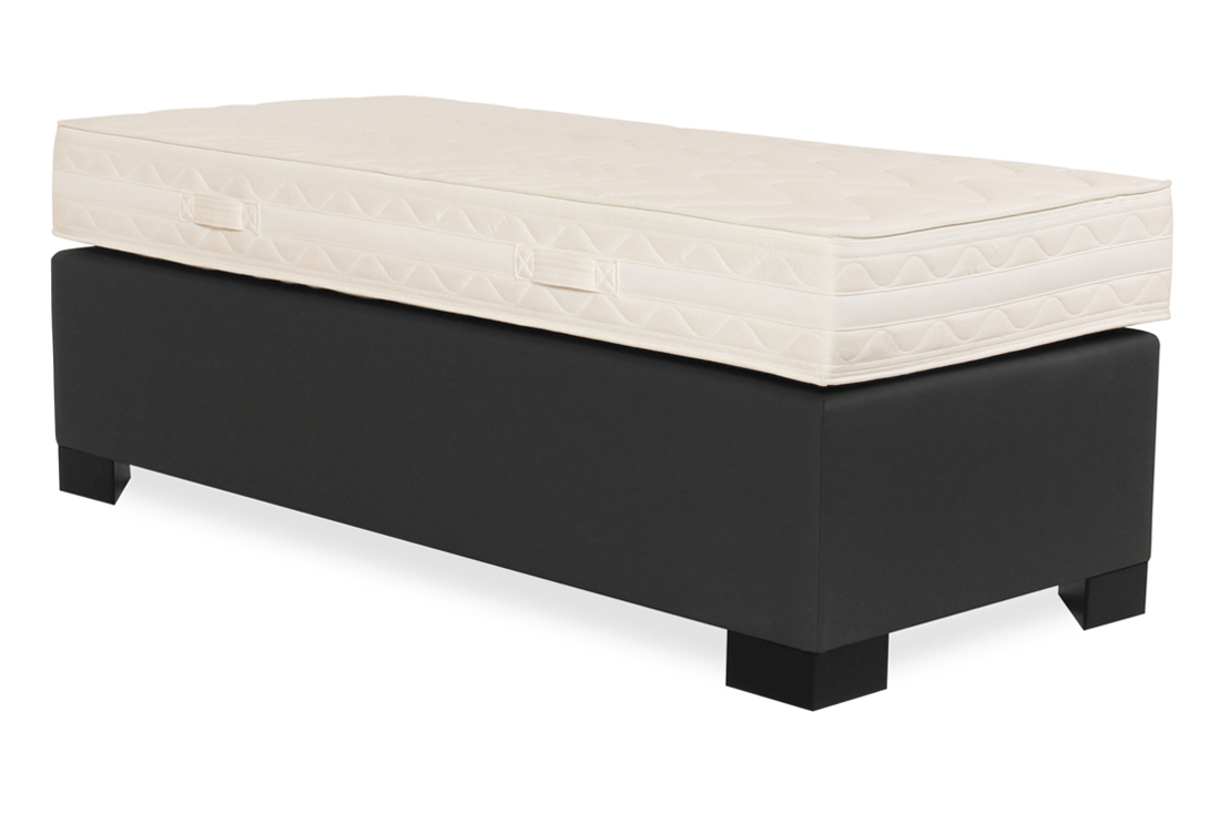 Gestoffeerd in diverse kleuren meubelstof en kunstleder. Voorzien van een spiegelstof met antislip om verschuiven van het matras te voorkomen.